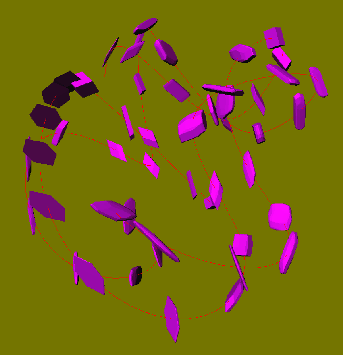 is an example for a continuous dynamical systems. For the image on the right the parameters b=3.0, c=0.25, d=0.2 and l=2.01 were chosen. The initial set is a box centered at the point (0.1, 0.1, 0.1) with radius 1E-9 and is indicated by an arrow. Note that all the zonotopes in the image needed to be magnified to make them visible.